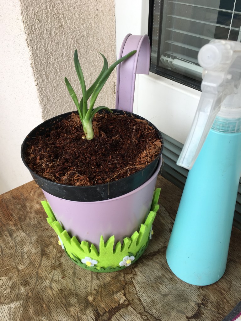The little onion. The story is that we had this little onion which started to grow some leaves in the food cupboard. So instead of throwing it away, I decided to give it a second chance and plant it. Now I am super proud that it’s still alive haha The moral of the story is : sometimes giving a second chance lets the opportunity to grow héhé 😛